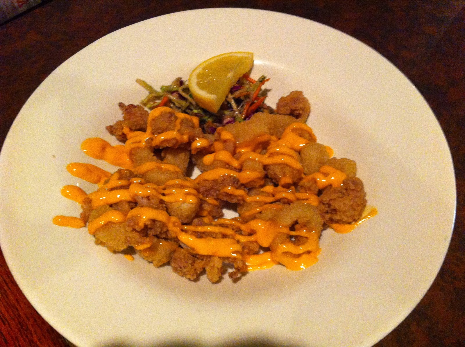 First, I'll tell you about the Stonecutter's lounge. You walk in to an incredible view of the west side of Seneca Lake and sit down in huge comfortable leather chairs - no slippery bar stools here - the kind of real chairs that make you want to stay the evening. They had an acoustic musician playing covers including James Taylor songs. My dad used to play me James Taylor songs when I was 5 on his guitar to get me to go to sleep, and I tried to call him to tell him but he wasn't in, and I just ended up telling my mom about how every time I typed in "Belhurst Castle" in Google it recommended "Belhurst Castle haunted" and how much the employees didn't find this nearly as entertaining as I did. Scott started with the panko crusted deep fried calamari with sweet and spicy broccoli slaw and sriracha aioli: